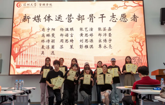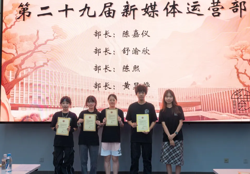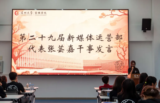 第29届新媒体运营部部长黄显烨学长发言道:“我们希望增加我们的覆盖面,让学院的声音传得更远,展现我们的利他精神。我们将加强团队内部培训,提升成员的专业技能和团队协作能力,打造一个更加专业、高效的新媒体运营团队。”
