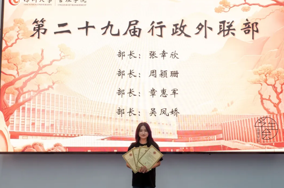 第29届行政外联部干事郜朔同学发言道:“在行政外联部这个温暖的大家庭里,团结是我们最有力的武器。每一次与校外机构的沟通、每一场赞助洽谈,都需要我们成员间紧密协作。从资料准备到方案策划,从临场应对到后续跟进,我们相互信任、彼此支持。遇到困难,我们共同面对;有了喜悦,我们一起分享。”
