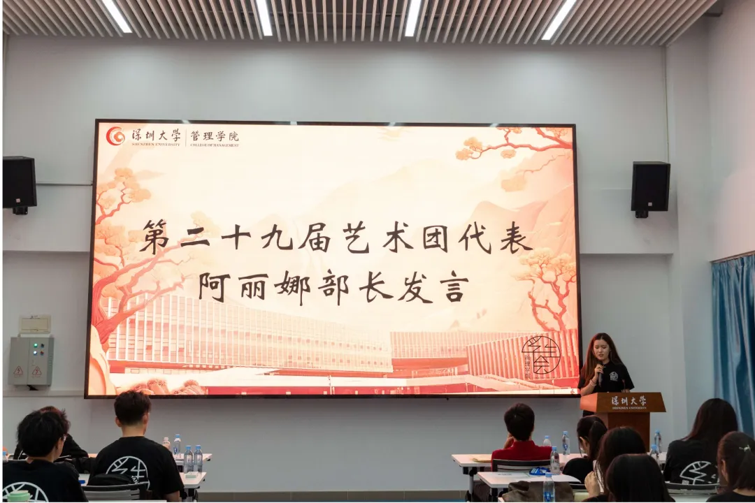 第29届艺术团部长阿丽娜学姐发言道:“我们希望你们能够在MAD积极主动地学习和工作,不断提升自己的能力和素质。同时,也希望你们能够保持热情和耐心,在面对困难和挑战时,不退缩、不放弃,勇于担当,积极作为。艺术团的学长学姐们将不遗余力地支持你们,帮助你们。”