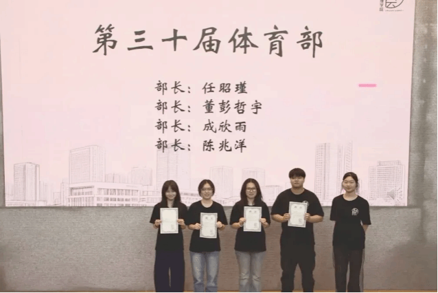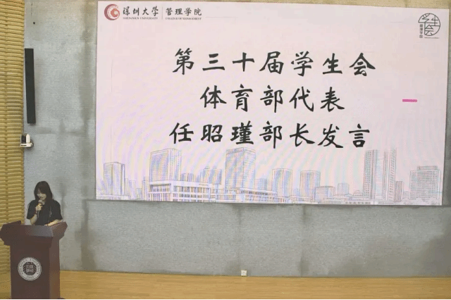 第30届体育部代表任昭瑾部长发言道:“过去一年,我们以竞技体育精神为内核,通过新生杯、趣味运动会、校运会等活动,丰富了全院学子的课余生活。部员们在并肩协作中收获归属感,结交挚友,这份热爱与情谊始终滚烫。30 届体育部已集结一群青春昂扬的新伙伴,九月破冰、十月赛事组织中,大家全情投入、默契渐生。后续校运会的选拔、训练与参赛,我们仍将全力以赴、尽善尽美。感谢主席的引领与各位部长的并肩,更感恩小部员们的信任选择。我们是部长,更是家人与后盾。愿我们怀揣初心、坚守热爱,在未来并肩同行,共筑体育部的美好明天,也祝愿管院学生会蒸蒸日上!”