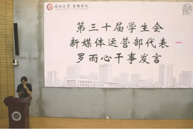 接下来是新媒体运营部。他们运营“深大管院学生会”官方公众号,策划举办讲座,进行主题采访,剪辑宣传视频,娓娓道来学院风采。