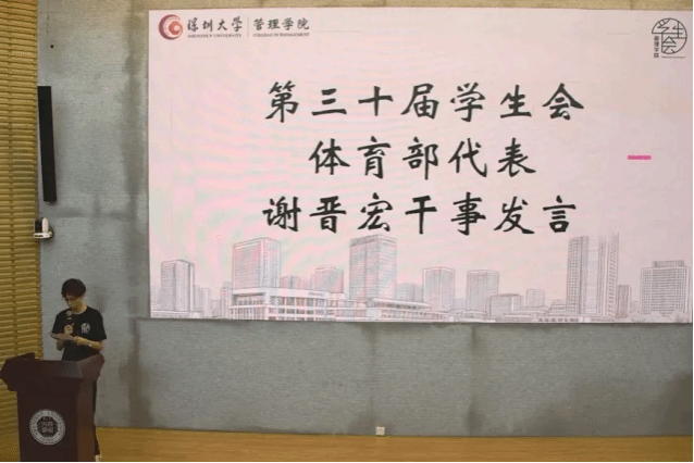第30届体育部代表谢晋宏干事发言道:“从初入校园的懵懂,到成为体育部一员的坚定,能在此为集体发光发热,我无比庆幸。九月破冰拉近距离,十月新生杯我们分工协作,在部长们的悉心引领下,不仅提升了能力,更收获了深厚情谊。体育是热血赛场,更是凝聚人心的纽带。面对即将到来的校运会,我们当仁不让,必将拼尽全力、尽善尽美。感谢学生会的信任、部长们的栽培与伙伴们的并肩。我们因热爱相聚,怀揣责任与信念,心往一处想、劲往一处使。愿以青春为翼、拼搏为刃,不惧挑战、并肩前行,让体育精神在管院绽放,让 30 届体育部成为骄傲的集体,共书管院体育崭新篇章!”