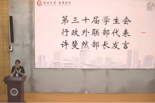 第30届行政外联部部长许斐然学姐发言道:“从初涉行政外联工作的生涩,到如今能熟练对接商家、优化流程,感恩学生会平台的锤炼与师长学姐的帮扶,这里是温暖的大家庭,更是成长的港湾。新征程上,我们将深耕本职:外联攻坚资源、行政提质增效,以更专业的服务赋能活动。我们会主动倾听同学需求,加强跨部门协作,凝聚合力践行‘服务同学’的核心目标。未来纵有挑战,行政外联部定当齐心协力、精益求精,与各部门并肩推动管院学生会蓬勃发展,不负信任与期待!”