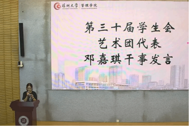 第30届艺术团代表邓嘉琪干事发言道:“我因对舞台背后故事的好奇加入这里,深知艺术团肩负着筹办管院晚会的使命——每一场难忘的晚会,都离不开细节的堆砌与全情的投入,是‘从执行到共赏’的完整旅程。作为新成员,我们渴望在学长学姐的带领下,学习策划思路、流程对接与创意技巧,稳步成长。更期待和伙伴们携手,碰撞创意火花,打磨贴合同学喜好的节目,把每一场晚会打造成管院独家记忆。这个温暖的集体里,我们既能收获技能,更能缔结友谊。往后我会以饱满状态投入工作,与大家并肩同行,为学生会发展、管院文艺氛围营造倾尽心力,共筑精彩!”