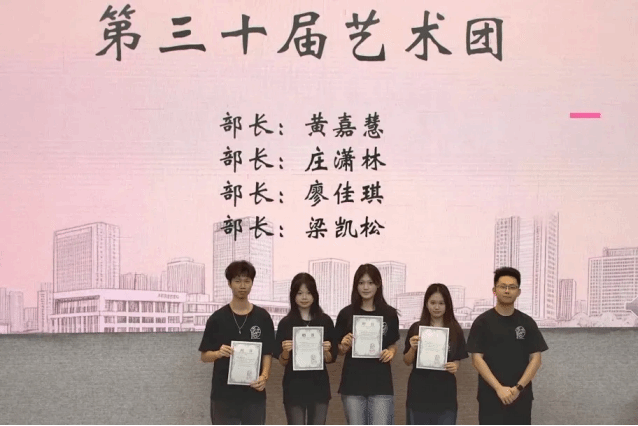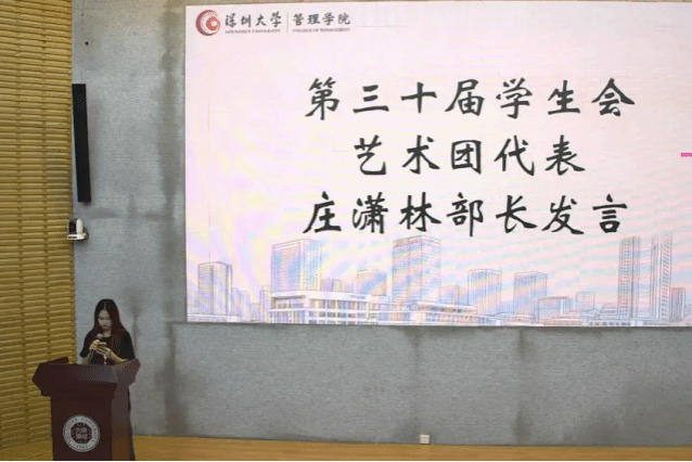 第30届艺术团代表庄潇林部长发言道:“过去一年,全体成员并肩奋斗,圆满完成各项任务,以认真严谨的态度对待台前幕后工作,为同学们搭建展示风采的舞台,为管院学生会发展贡献力量。在艺术团,我们收获实用技能、真挚友谊与珍贵回忆,其成长离不开管院学生会平台、谭老师的指导、主席们的付出及每位伙伴的相遇。今年迎来 17 位优秀新部员,欢迎你们加入。未来一年,艺术团是你们展示创造力的舞台,你们将参与晚会策划执行,锻炼综合能力。希望你们珍惜机遇,积极投入,在实践中提升自我。艺术团不仅是工作团队,更是充满热爱与活力的大家庭,期待你们收获情谊与心得。”