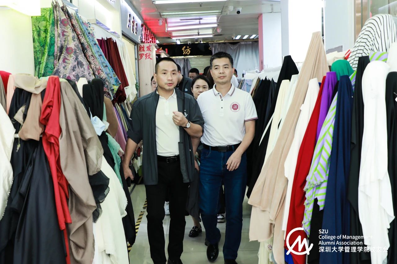 在走进一家规模较大的布料店时,吴国升校友便介绍绫罗绸缎的不同,并指出该店的过人之处:紧跟时代潮流,开展直播活动;积极对外买版开展会,结合中外文化和传统、现代文化;注重质量,打好品牌。通过对每一家店的考察,让我们更加深入直面的了解轻纺业的发展机遇。