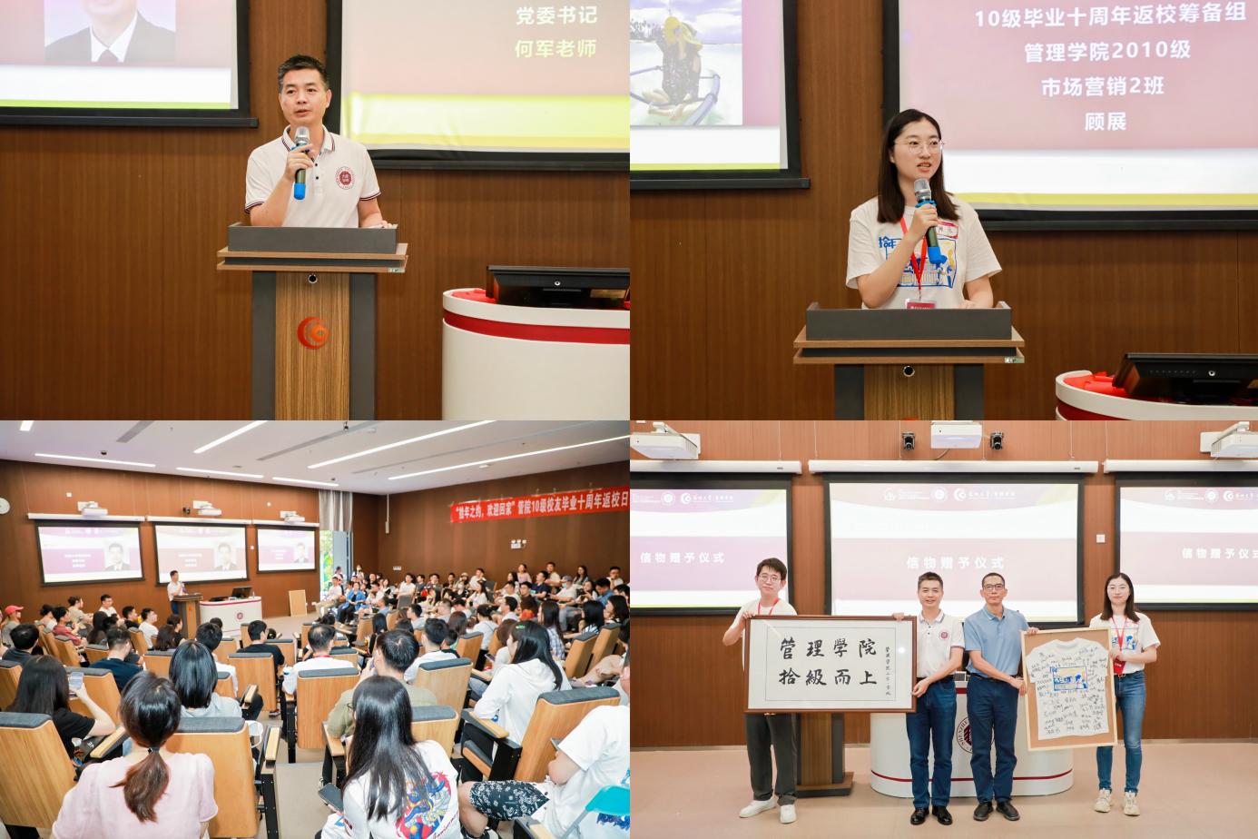 在随后的信物赠予仪式中,10级全体校友向学院赠送了精心准备的字画和校友签名文化衫,以表达对母校的无限感激和美好祝愿,全体嘉宾和校友一起合影留念,定格住这个温馨快乐的时刻。