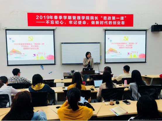 2019年3月19日中午12点,管理学院研究生党员们在文科楼MBA教室专心致志地听讲,眼神里充满了对知识的渴求,这里正在举办2019年春季新学期管理学院院长思政第一课,本次讲座的主题为“不忘初心,牢记使命,做新时代的创业者”,讲座由管理学院院长李丽教授主讲,众多研究生党员参与聆听了党课。