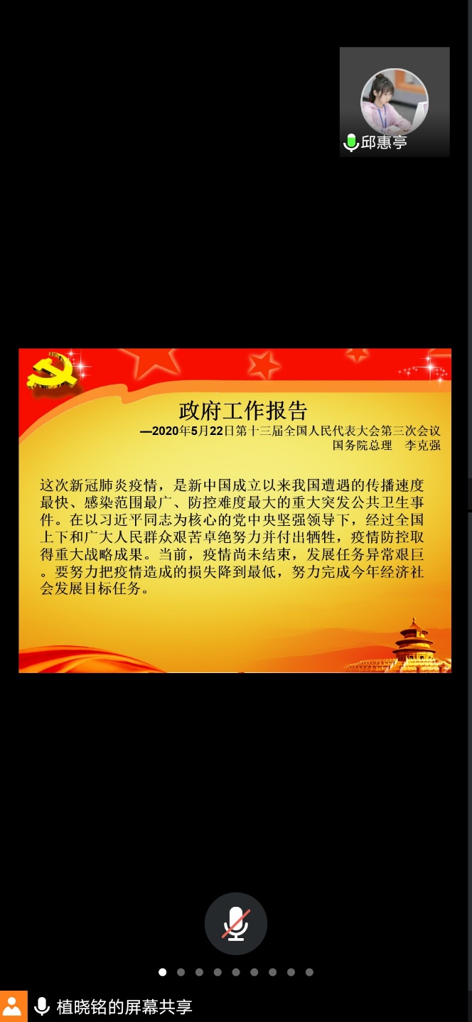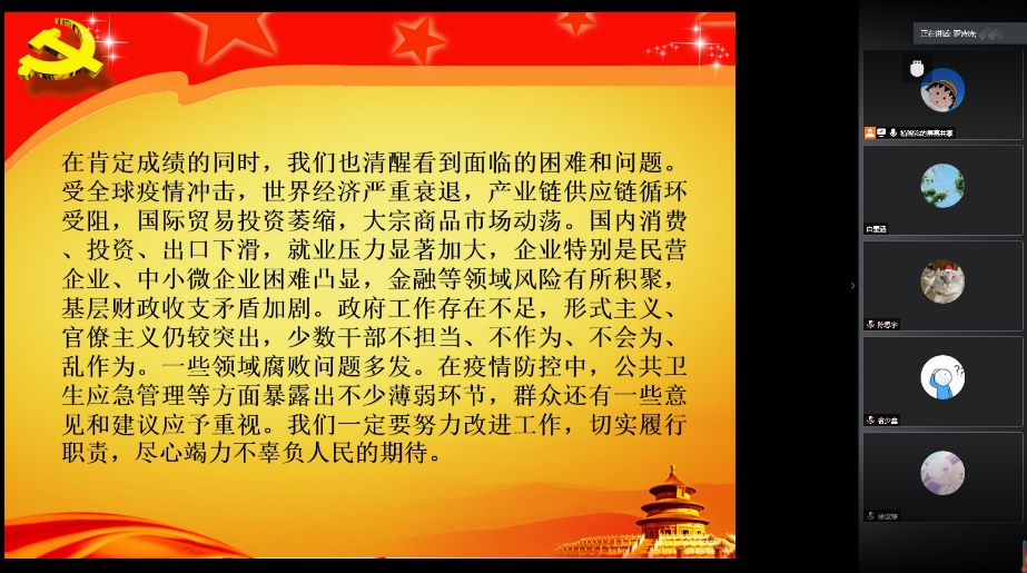 结合校党委开展学习两会精神通知要求,本支部于2020年6月20日19:00-20:30组织了6月份主题党日活动,通过线上交流方式,围绕以下三个主题在腾讯会议展开讨论: