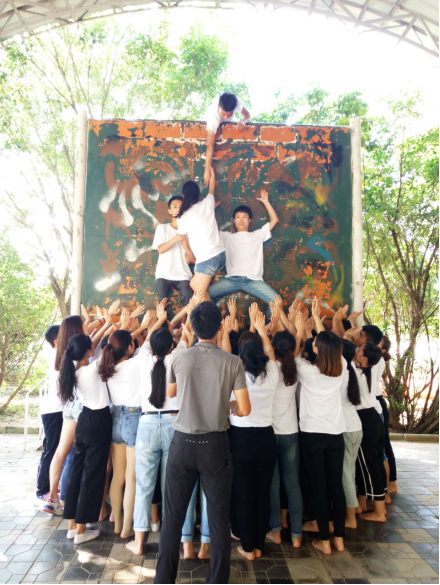 最后一项任务是需要所有团队成员在不借助外力的情况下合作攀爬4.2米的毕业墙。在整个过程中完全依靠人梯,一个个攀爬上去,而在翻越过程中, 如果任何一个人违反游戏规则,所有人员就要重新攀爬。期间违反了两次规则,人墙二度撤离,大家限入了深深的思考,形成一种无声的默契和爆发力。虽然过程艰辛,但同学们还是很棒地完成了看似不可能完成的任务。