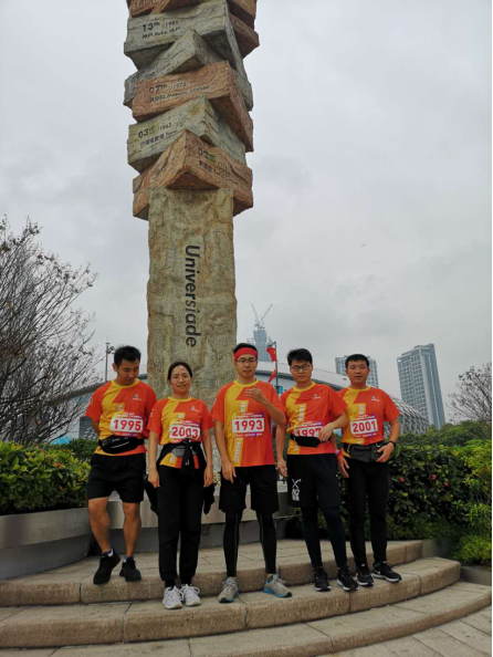 本次活动共设两种项目:5公里组和10公里组。线路为运动公园至火炬广场折返跑(5公里)和运动公园至北湾鹭港折返跑(10公里)。由于研究生分团平时就练就了跑步锻炼的基础,因此队员们此次报名参加的均为10公里项目。大家一边跑,一边拍,每到一处标志物,研究生分团的五名队员便驻足拍照留念,寓跑于乐,既增添了跑步的趣味,又为新年第一跑留下了很多珍贵的记忆。一个小时之后,大部分参赛者已完成比赛,研究生分团的五名队员也顺利到达了终点,并领取了完赛纪念奖牌,最后大家在深圳湾公园合影留念。