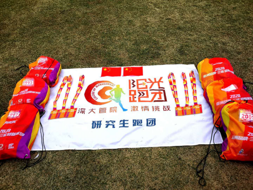图4 阳光跑团研究生分团队旗、活动包、奖牌和国旗的合影