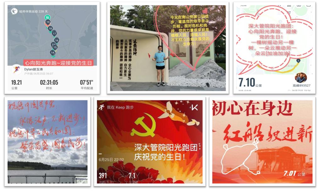 为庆祝党的生日,激励共产党人坚守初心,管理学院阳光跑团近日成功组织开展了“心向阳光奔跑,迎接党的生日”系列云活动,号召广大跑团队员通过运动来庆祝党的生日。本次活动由阳光跑团研究生分团策划发起,得到了学院党委的大力支持,吸引了阳光跑团教师分团、研究生分团、MBA分团以及本科生分团的很多师生队员积极参与活动。