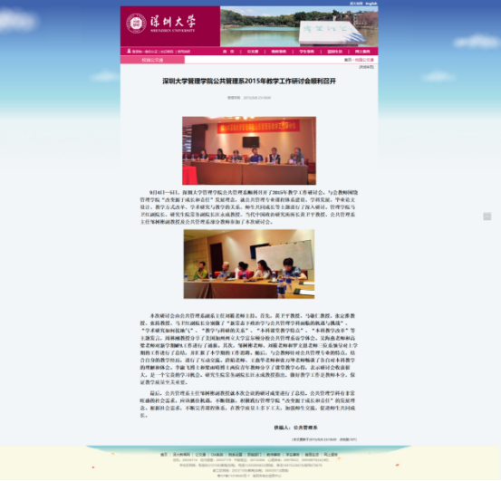 2015年9月4日—5日,深圳大学管理学院公共管理系顺利召开了2015年教学工作研讨会。与会教师围绕管理学院“改变源于成长和责任”发展理念,就公共管理专业课程体系建设、学科发展、毕业论文设计、教学方式改革、学术研究与教学的关系、师生共同成长等主题进行了深入研讨。管理学院马卫红副院长、研究生院常务副院长汪永成教授、当代中国政治研究所所长黄卫平教授、公共管理系主任邹树彬副教授及公共管理系部分教师参加了本次研讨会。