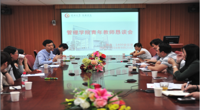 2016年9月21日中午,管理学院在文科楼1400会议室召开青年教师恳谈会。院长刘军教授、党委书记李丽教授等院领导与学院近3年新入职的15名青年教师就教学、科研、公共责任及生活等主题一起畅谈、诚恳交流,会议高效而气氛热烈。