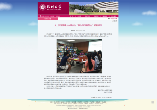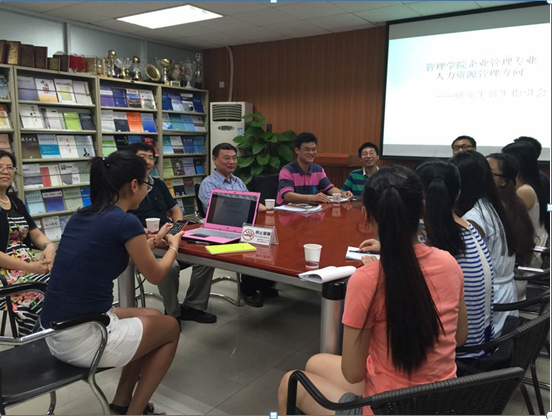 2015年9月22日中午,管理学院人力资源管理系研究生“新生学习指引会”在学院资料室顺利举行。管理学院院长刘军教授和人力资源管理方向导师蒋建武、丁夏齐、王忠、张转玲、文姗姗等老师及8位研究生新生参加了此次指引会。