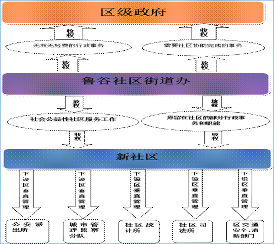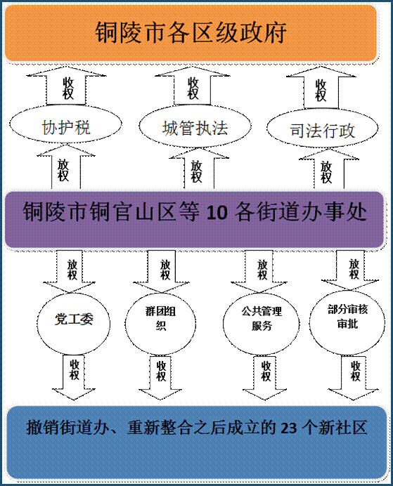 铜陵市全面启动社区综合体制改革所选的第一个“样本”——铜官山区为主体的城区10个街道办事处,第一步,全部撤销;第二步,将原先拥有的61个社区居委会整合为23个新型的“大社区”,减少了管理对象的数量;第三步,将改革中最重要的权力职能归属问题梳理清楚,避免了改革中涉及的权、责、利的模糊问题——将原街道党工委、群团组织等职能和原街道办事处相关公共管理服务、部分审核审批等职能下放到社区,把原街道的协护税、城管执法、司法行政等职能收归区直相关部门。[14]第四步,减少宏观层级,即,改革的核心是撤销街道办事处,实行区直接服务的社区体制,通过撤销街道办,变“市-区-街道-社区”四级管理模式为“市-区-社区”三级服务形式,形式上的“减法”、本质上的“加法”。[15]
