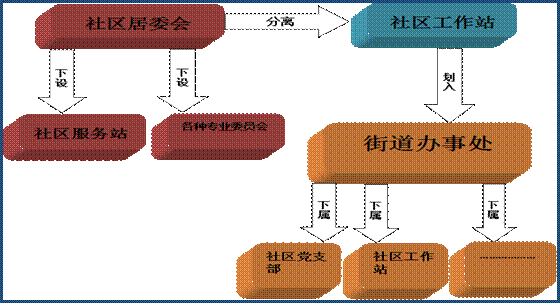 第三步,把集行政、服务、自治功能于一体的居委会职能在组织内部进行分解, 重新架构起了三个社区类型,即决策居委会服务的自治组织居委会、承担行政职能的社区工作站和承担社区服务功能的社区服务站。[7]而社区工作站和社区服务站是社区居委会的下设机构。