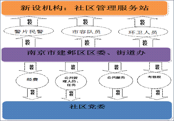 建邺区政府打破以区、街道、社区三级老体制为核心的层级管理,将责、权、利直通社区——区委直管社区党委书记;单独编制社区财政预算,社区经费由区财政直拨;进入社区的公共管理与服务项目,必须做到任务、经费、人员和服务四个“同步下放”;同时,区委也将社区各类人员的考核权下放社区。