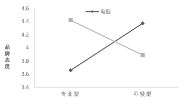 通过单因素方差分析,结果显示:虚拟代言人特征对品牌态度的主效应(F(1,111)=0.023,p> 0.1)和产品类别对品牌态度的主效应(F(1,111)=2.477,P> 0.1)均不显著,虚拟代言人特征和产品类别对品牌态度的交互作用显著(F(1,111)=11.877,p< 0.01),如图2所示。对于电脑而言,被试对可爱型虚拟代言人的品牌态度(M=4.33)显著高于对专业型虚拟代言人的品牌态度(M=3.72),F(1,57)=7.498,p< 0.05;对于旅行箱而言,被试对专业型虚拟代言人的品牌态度(M=4.04)显著高于对可爱型虚拟代言人的品牌态度(M=3.48),F(1,54)=4.71,p< 0.05。实验一的结果支持假设H1a和H1b。