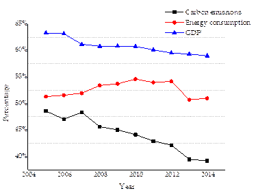 Data source: Details of measurement in carbon emissions can be found in section 4.1; Energy consumptions and GDP are from NBSC (2006-2015b), NBSC (2006-2015a), respectively.