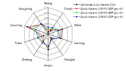 First, traditional industrial provinces (such as Shandong and Hebei) warrant lower increments of carbon emission quotas. They have relatively high historically accumulated emissions while low ratings in terms of energy efficiency, and thus these provinces have enormous potential to reduce emissions. For this, those provinces should place a far greater emphasis on their efforts to reduce carbon intensity. On the other hand, areas such as Beijing, Tianjin and Fujian, however, with mature industrial structures and historically low carbon emissions, warrant quotas that actually exceed their CO2 emissions.