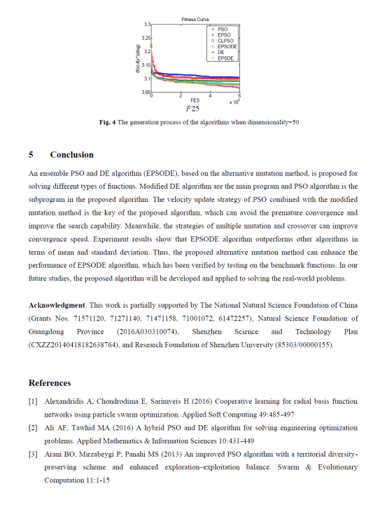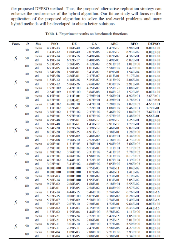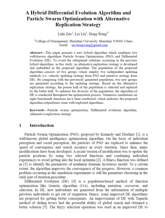 2.Lulu Zuo(左路路), Lei Liu, Hong Wang*, and Lijing Tan*. A Hybrid Differential Evolution Algorithm and Particle Swarm Optimization with Alternative Replication Strategy. Advances in Swarm Intelligence. 9th International Conference, ICSI 2018, Shanghai, China, 17-22 June 2018.