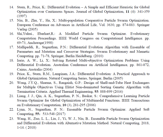 1.Hong Wang, Lulu Zuo(左路路), Jia Liu(刘佳), Wenjie Yi(蚁文洁), Ben Niu*. Ensemble Particle Swarm Optimization and Differential Evolution with Alternative Mutation Method. 2018,Natural Computing Online.