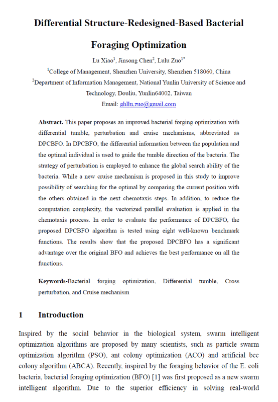 3.Lu Xiao, Jinsong Chen, Lulu Zuo*(左路路), Huan Wang, and Lijing Tan. Differential Structure-Redesigned-Based Bacterial Foraging Optimization. 9th International Conference, ICSI 2018, Shanghai, China, 17-22 June 2018.