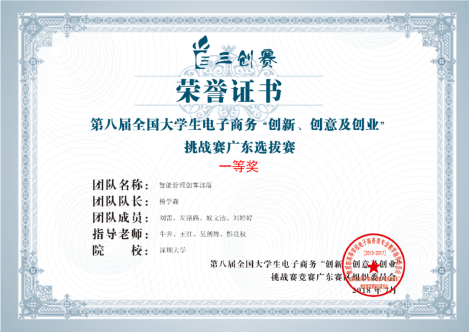 由中华人民共和国教育部主管,教育部高等学校电子商务类专业教学指导委员会主办第八届全国大学生电子商务“创新、创意及创业”挑战赛(以下简称“三创赛”)广东赛区选拔赛于2018年6月10日在中山大学南方学院隆重举行。深圳大学代表队首次参与该赛事,其中管科系研究生团队智能管理创客部落”以及“游任犹鱼小组”在牛奔、王红、杨辰等多位指导老师的带领下,获得了省赛一等奖,以及最佳指导奖、最佳创业奖