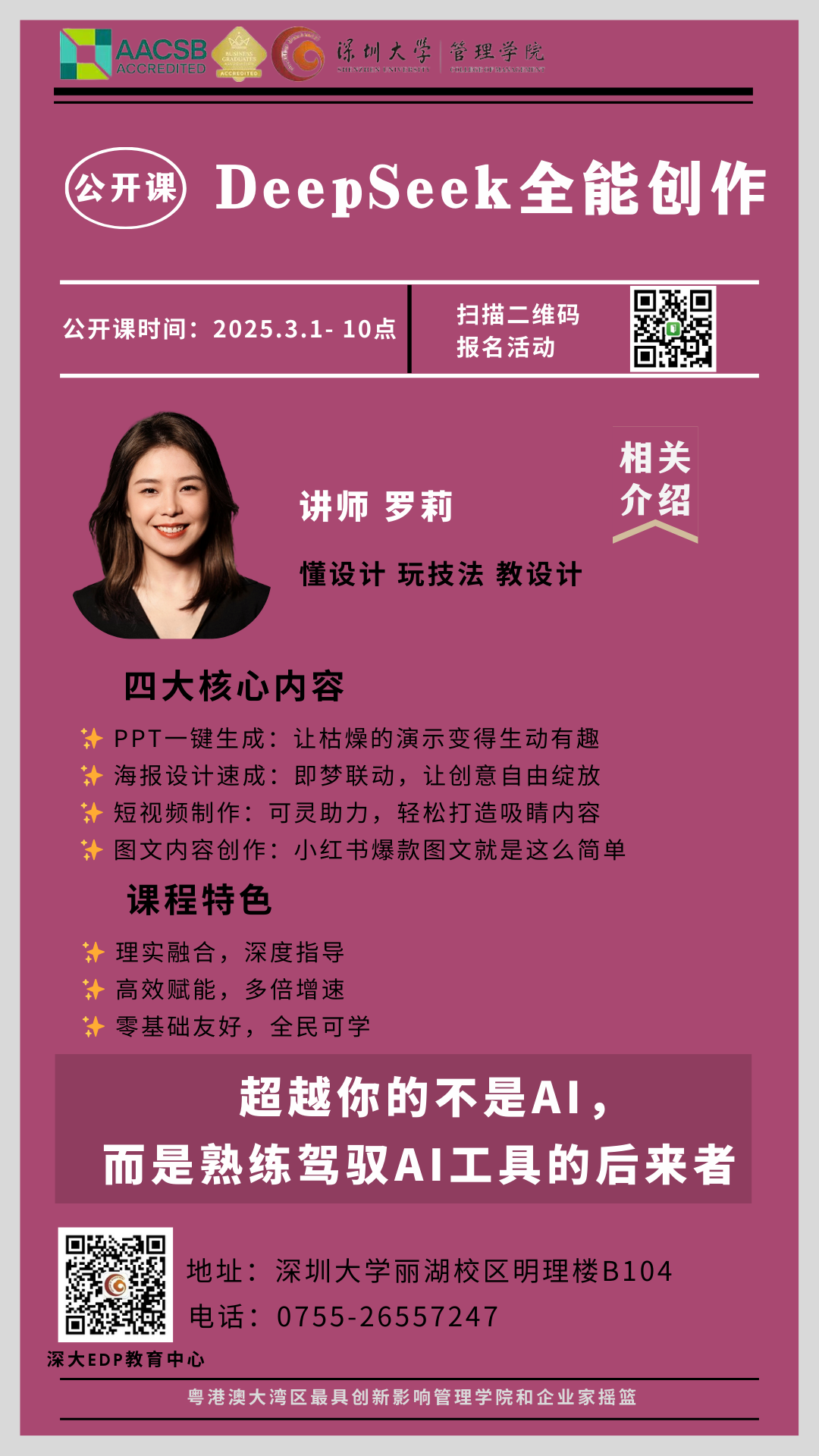 在数字化转型加速、创新驱动发展战略深入实施的当下,国家大力倡导利用新兴技术推动产业升级与创新发展 ,AI技术作为关键创新力量,已深度融入职场与创业领域,成为不可或缺的关键技能。2025年3月1日,深圳大学EDP培训教育中心将推出「DeepSeek全能创作」公开课。本次公开课旨在助力每一位热爱学习的朋友熟练掌握设计、短视频、爆款图文创作技巧,以AI为翼,开启高效创作的崭新时代,为个人职业发展与创业突破赋能,契合国家鼓励创新与技术应用的导向,培养适应新时代需求的创新型人才。