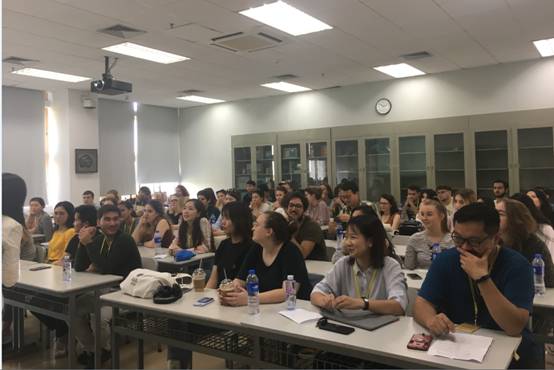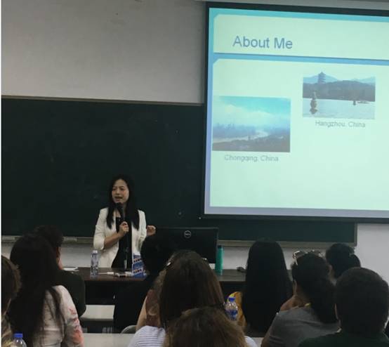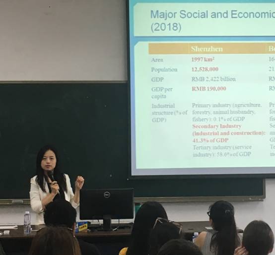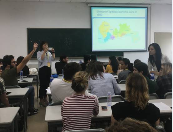 接下来的安排,是由我院丁婉玲老师为华师大留学生团做讲座。丁老师开场以其自身的经历,从“求学到来深圳工作,最后选择定居深圳以及对深圳的体会”作为开场白,她以极其幽默诙谐、充满智慧又轻松愉快的谈吐引得华师大满座留学生哄堂大笑,连华师大两位带队老师也频频忍俊不禁,全场的注意力均无一例外地集中在丁婉玲老师身上。