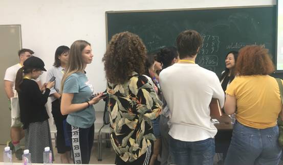 讲座结束后,华师大留学生意犹未尽,群集在丁婉玲老师的左右提问了将近半小时之久。丁老师耐心十足,一一细致地答复了每一位留学生的问题,最后应留学生们的强烈请求,丁老师在黑板上写下自己的邮箱地址,欢迎留学生写邮件给自己以互相交流学习。